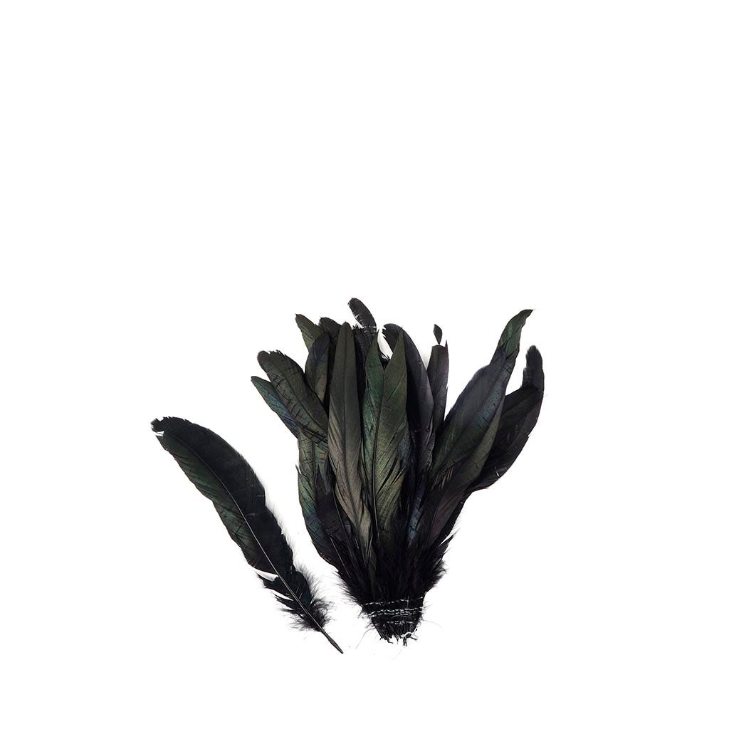 Dyed Half Bronze Iridescent-Rooster Coque Tail Feathers approximately 7-10 inches long in a 25 piece package are strung (sewn) together near the tip of each quill. These coque tails are dyed, but still have a greenish-black iridescent sheen within the feather. Coque tail feathers have a sturdy, but flexible spine (quill), and the body of the feather tends to be approximately 3/4-1 inch wide.