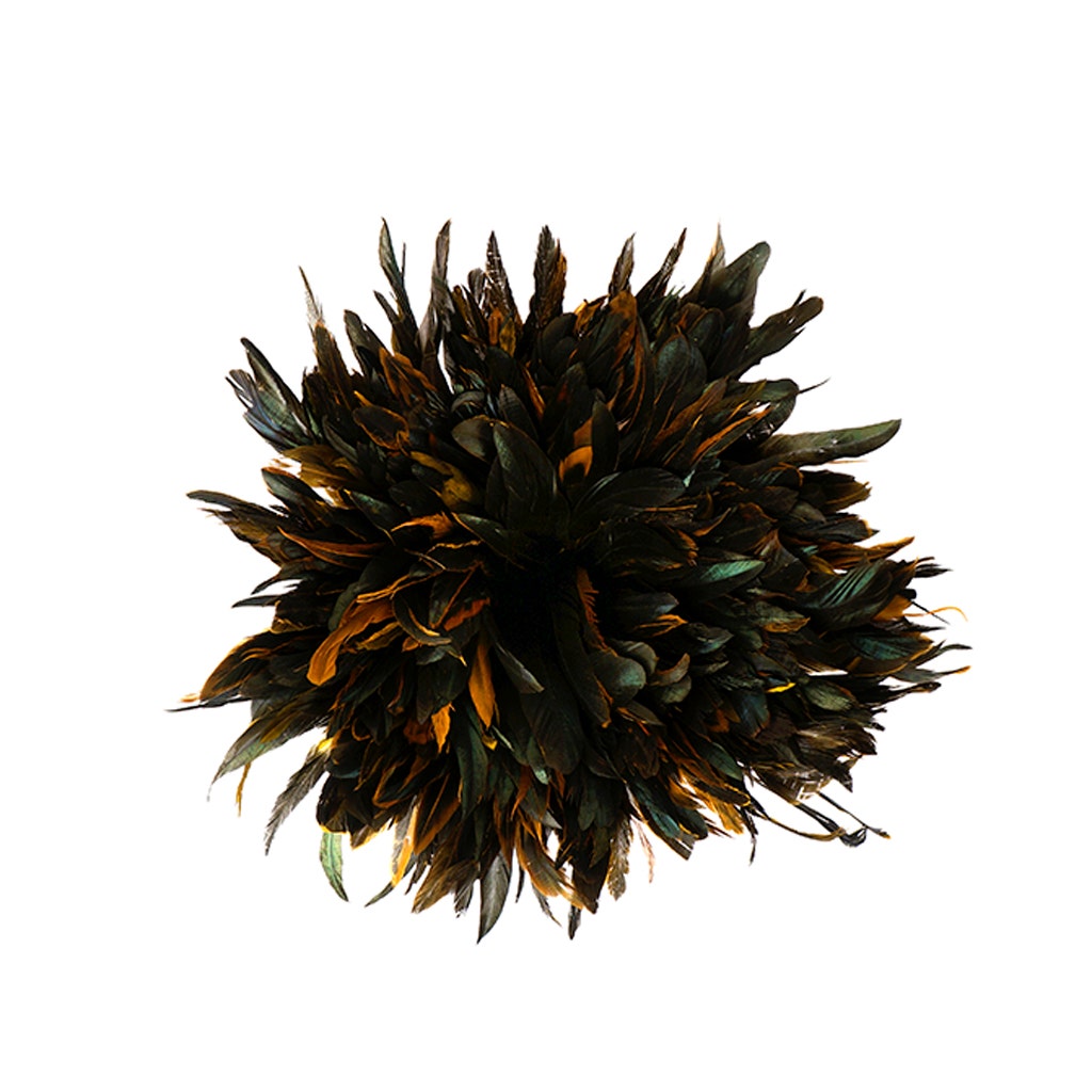 Dyed Half Bronze Iridescent-Rooster Coque Tail Feathers approximately 7-10 inches long are strung (sewn) together near the tip of each quill. These feathers are dyed over natural Half-Bronze coque tails, but will still retain the greenish-black iridescent sheen wherever present. The dye that is used on these feathers is not colorfast, and has the tendency to slightly rub off when handled. Rooster coque tail feathers have a sturdy, but flexible spine (quill), and the body of the feather tends to be approximately 3/4-1 inch wide.