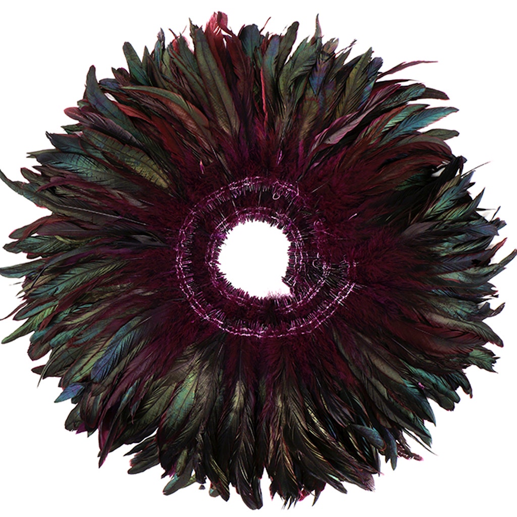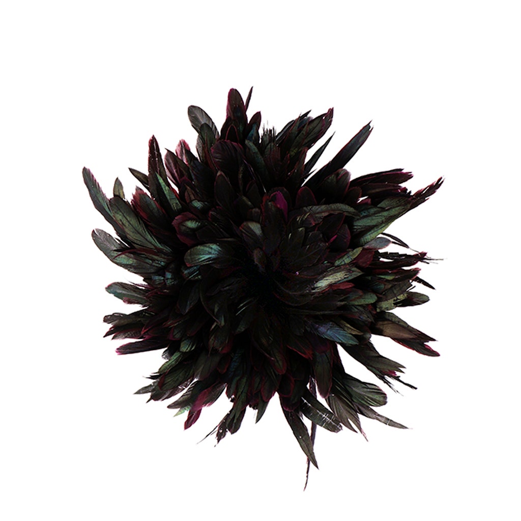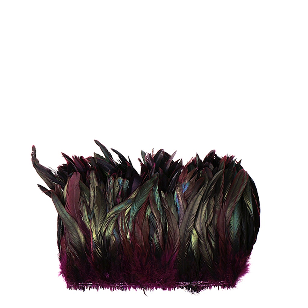 Dyed Half Bronze Iridescent-Rooster Coque Tail Feathers approximately 7-10 inches long are strung (sewn) together near the tip of each quill. These feathers are dyed over natural Half-Bronze coque tails, but will still retain the greenish-black iridescent sheen wherever present. The dye that is used on these feathers is not colorfast, and has the tendency to slightly rub off when handled. Rooster coque tail feathers have a sturdy, but flexible spine (quill), and the body of the feather tends to be approximately 3/4-1 inch wide.