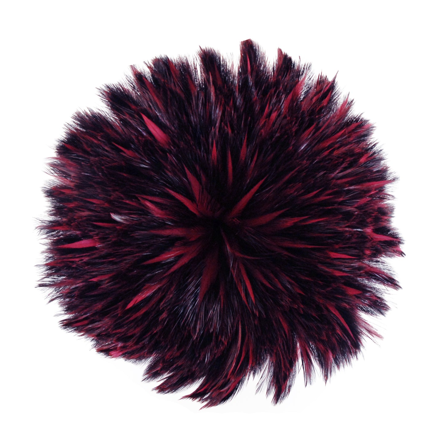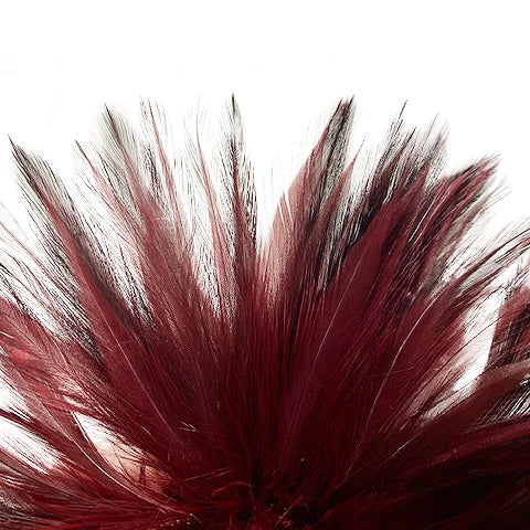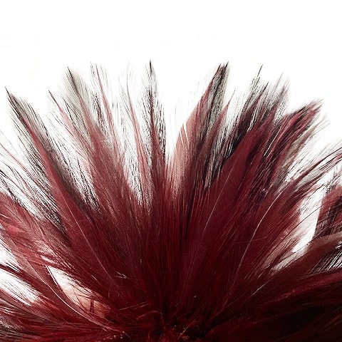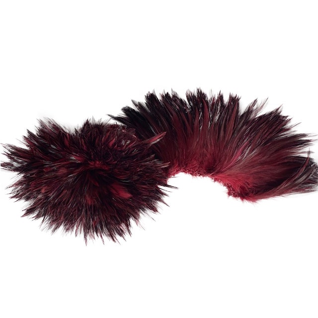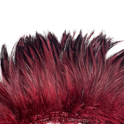 Rooster Furnace (neck) Hackle Feathers 4-6 inches are strung (sewn) together near the tip of the quill. The body of rooster hackle feathers are usually no wider than 1/2" and are soft and flexible with very little fluff near the quill. These rooster feathers are thin and wispy (almost see through) thin, and and pointed at the tip. This style of feather identified as furnace is slightly degraded to absorb rich color dyes but remain shiny.