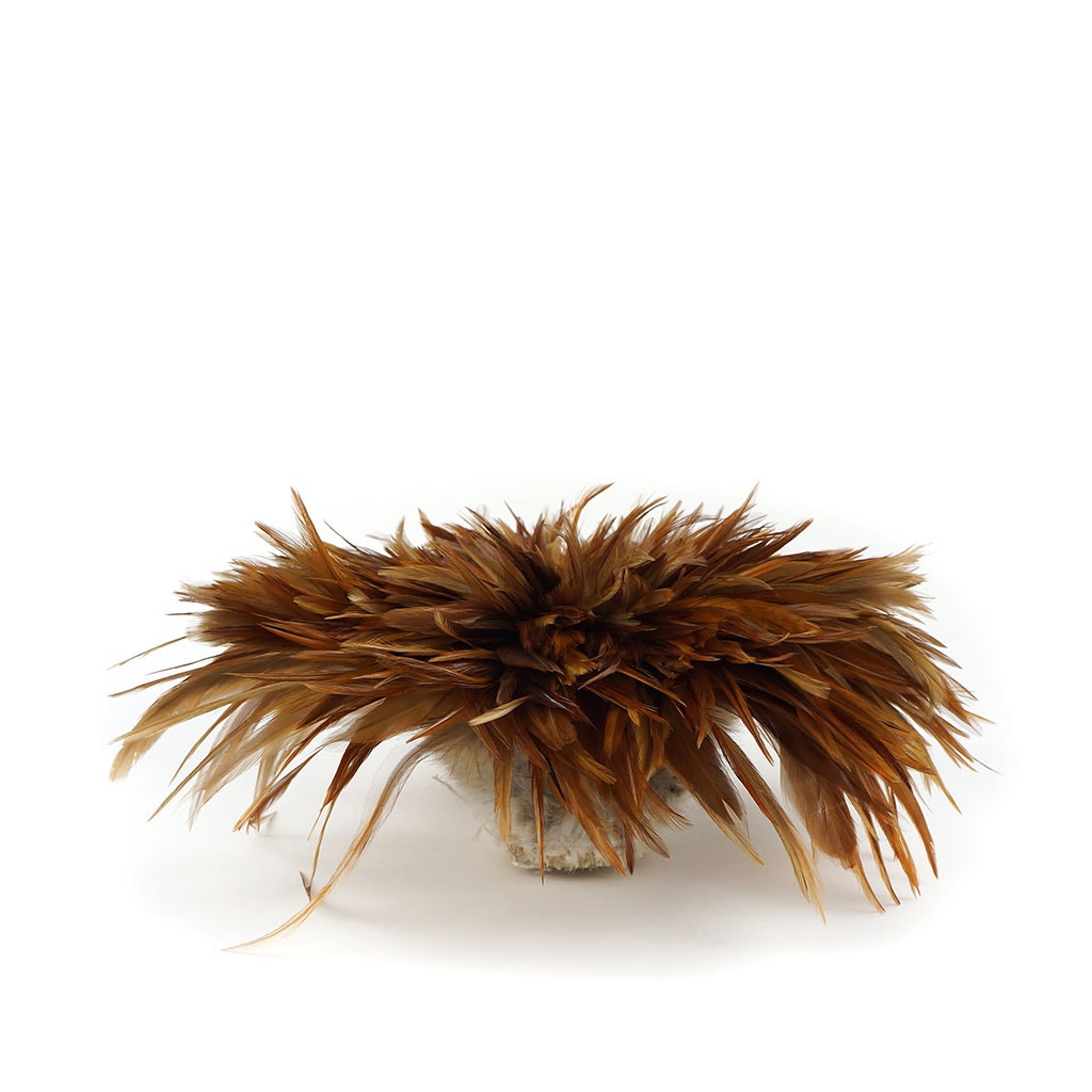 Strung Rooster Natural-Red Saddle Feathers approximately 5.5-7.5 inches long x 1 yard units are strung (sewn) together near the tip of each quill. Rooster saddle (back) feathers are long and narrow, with a sharp pointed tip (between 1/4-1/2 inches wide). Saddles tend to have a natural sheen and are fluffy, soft flexible feathers. This style of feather identified as Natural-Red and is a rusty, reddish- brown to light tan color.