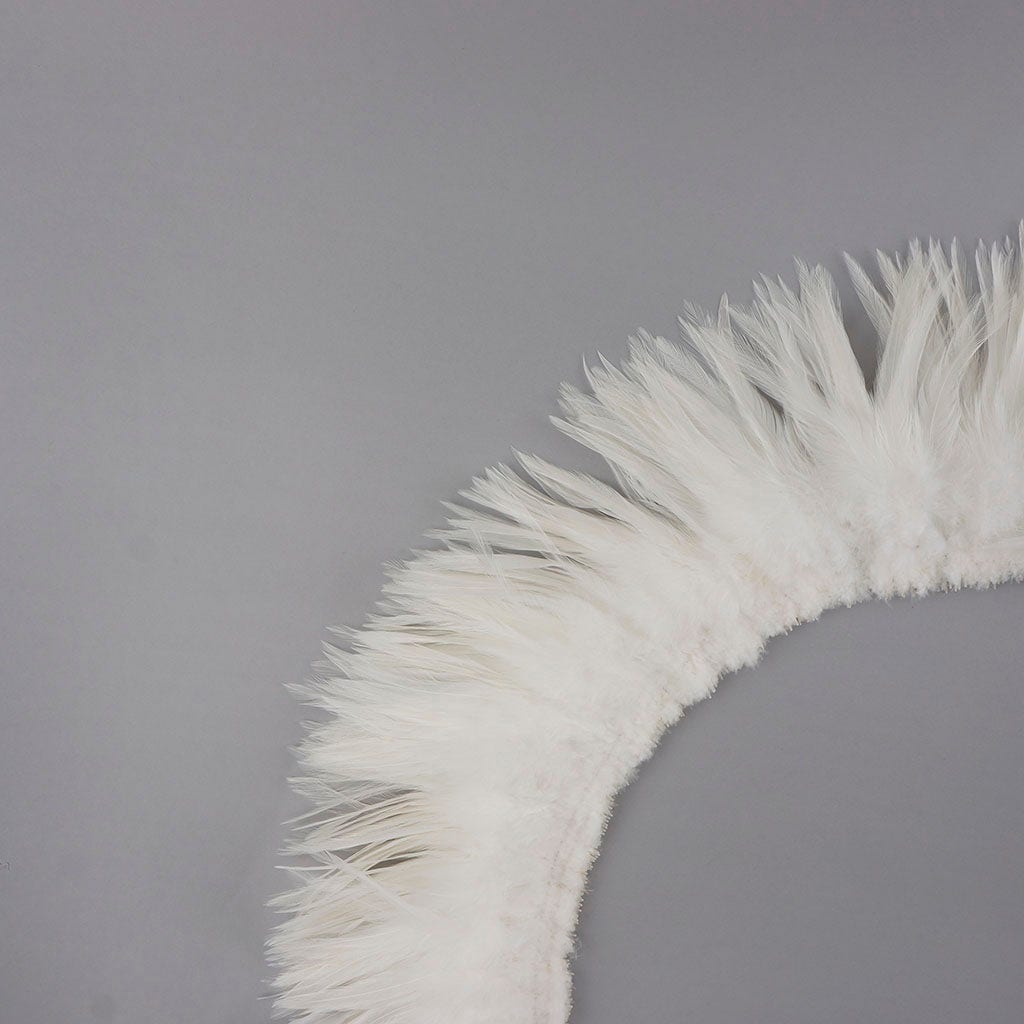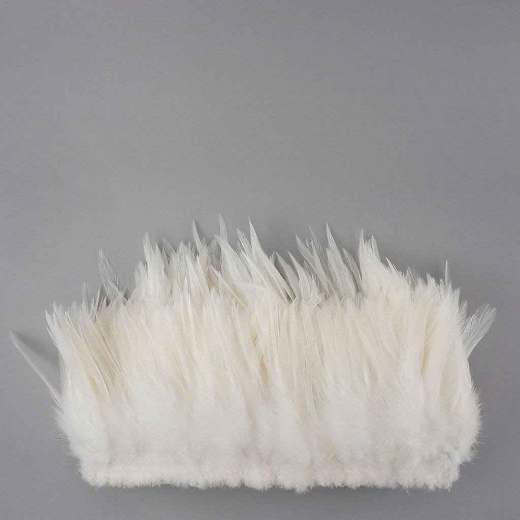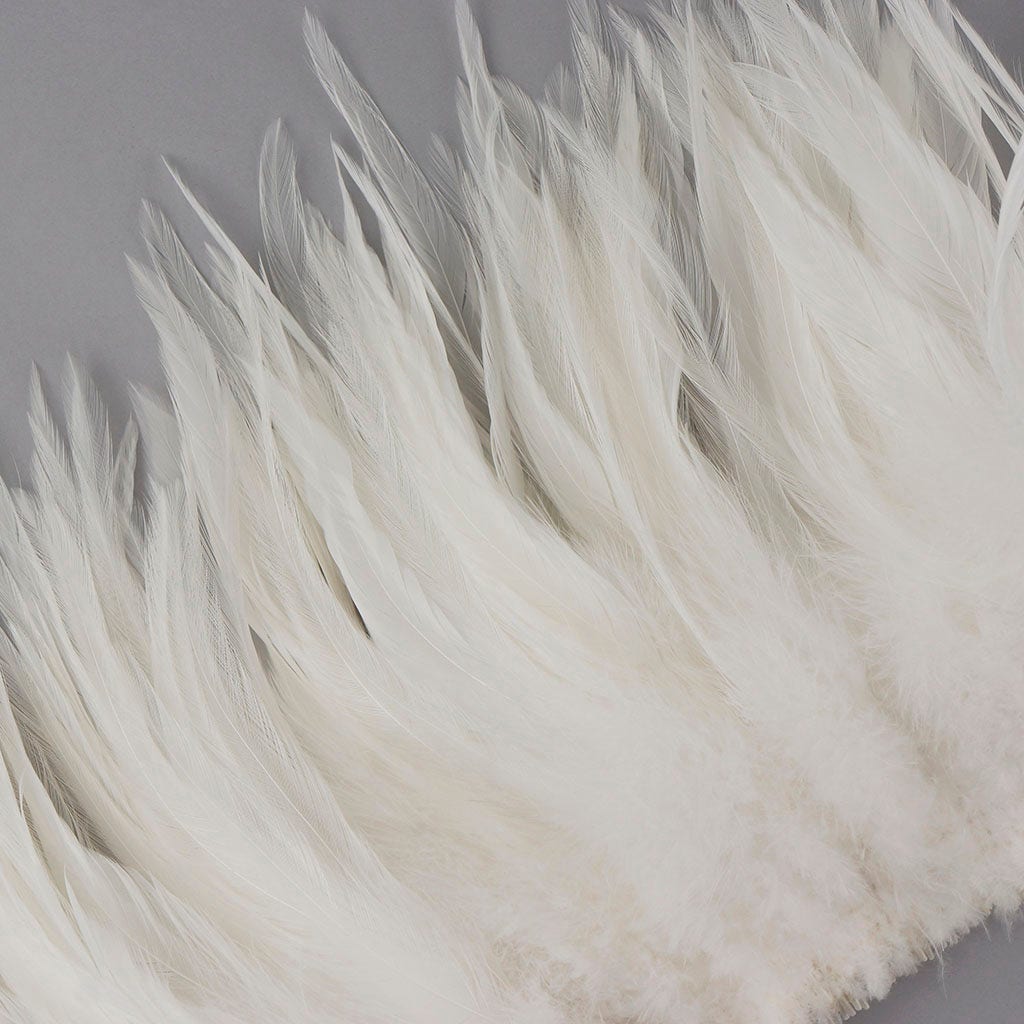Strung Rooster White-Dyed Saddle Feathers approximately 6-8 inches long are strung (sewn) together near the tip of each quill. Rooster saddle (back) feathers are long and narrow, with a sharp pointed tip (between 1/4-1/2 inch wide). Saddles tend to have a natural sheen and are fluffy, soft flexible feathers. Dyed over white saddle feathers will be bright, vivid colors.