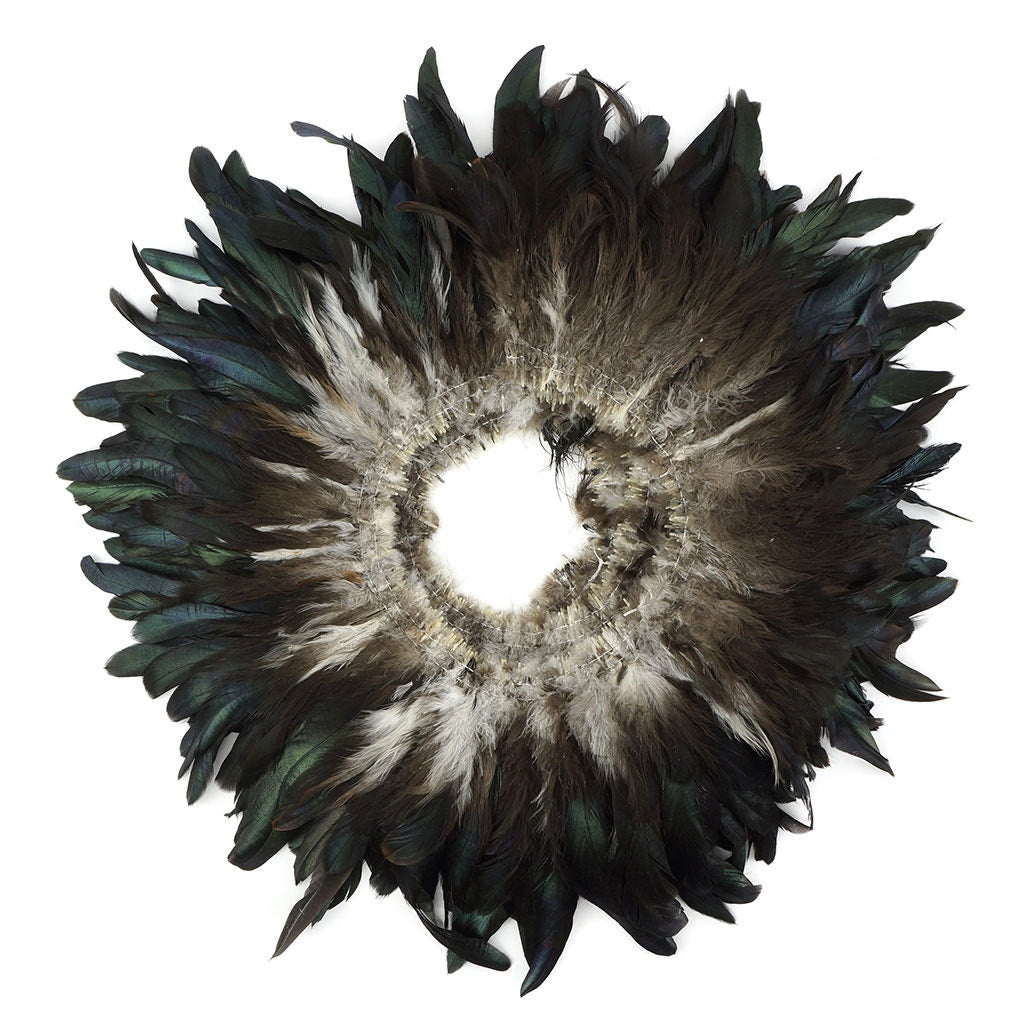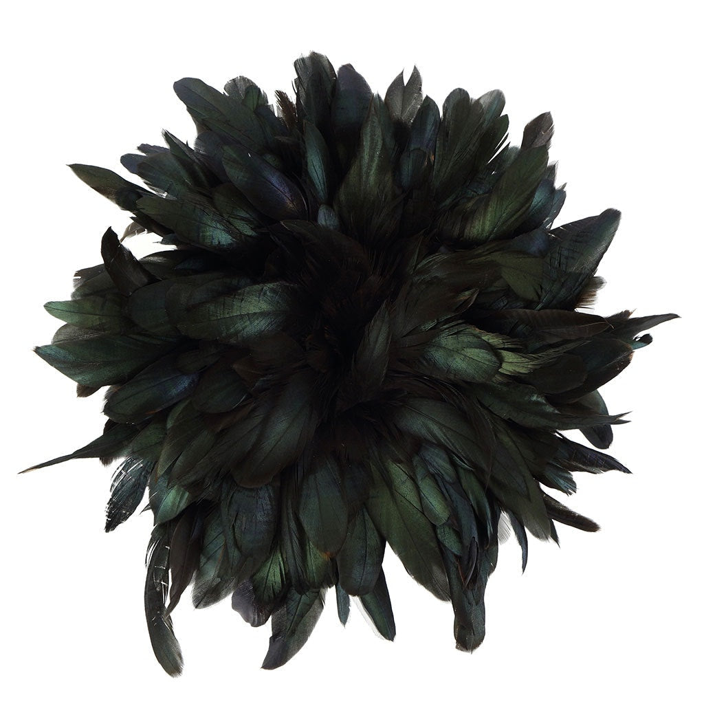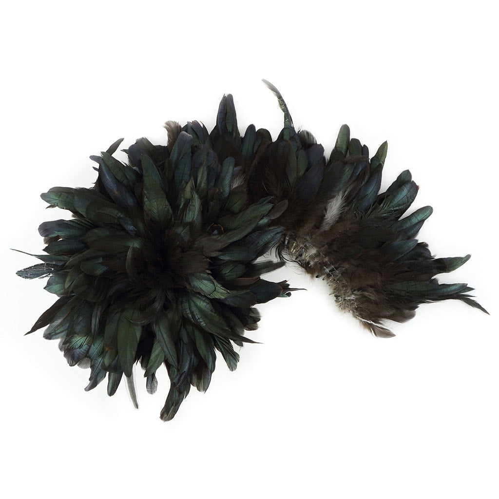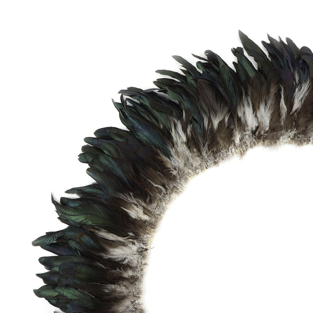 Strung Rooster Bronze Schlappen Feathers approximately 4-6 inches long x 1 yard unit are strung (sewn) together near the tip of each quill. Rooster schlappen (body) feathers are thicker than saddles or hackle feathers (ranging 1/2-3/4 inch wide), and are more rounded at the tip. Schlappen feathers soft flexible feathers, and fluffy near the quill. This variety of schlappen identified as Bronze, is naturally fluffy white at the end of the quill with a greenish iridescent color covering the entire feather.