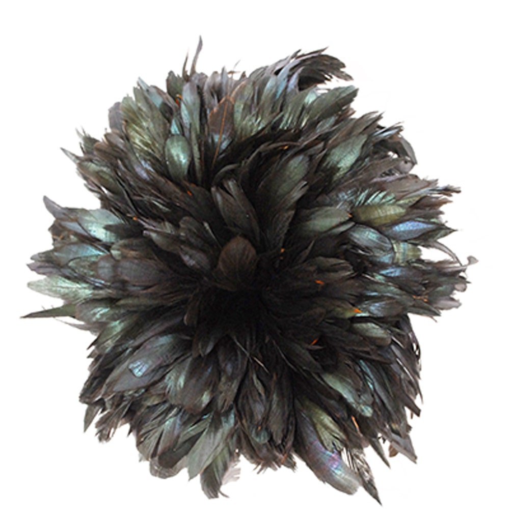 Strung Rooster Bronze Schlappen Feathers approximately 6-8 inches long x 1 yard unit are strung (sewn) together near the tip of each quill. Rooster schlappen (body) feathers are thicker than saddles or hackle feathers (ranging 1/2-3/4 inch wide), and are more rounded at the tip. Schalappen feathers soft flexible feathers, and fluffy near the quill. This variety of schlappen identified as Bronze, is naturally fluffy white at the end of the quill with a greenish iridescent color covering the entire feather.