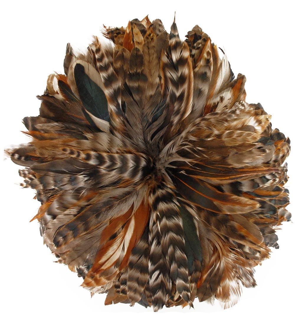 Strung Rooster Red Chinchilla Schlappen Feathers approximately 6-8 inches long x 1/2 yard unit are strung (sewn) together near the tip of each quill. Rooster schlappen (body) feathers are thicker than saddles or hackle feathers (ranging 1/2-3/4 inch wide), and are more rounded at the tip. Schalappen feathers soft flexible feathers, and fluffy near the quill. This variety of schlappen feathers are identified as natural Red Chinchilla tends to be white with light, reddish-brown markings or bars across the body of the feather.