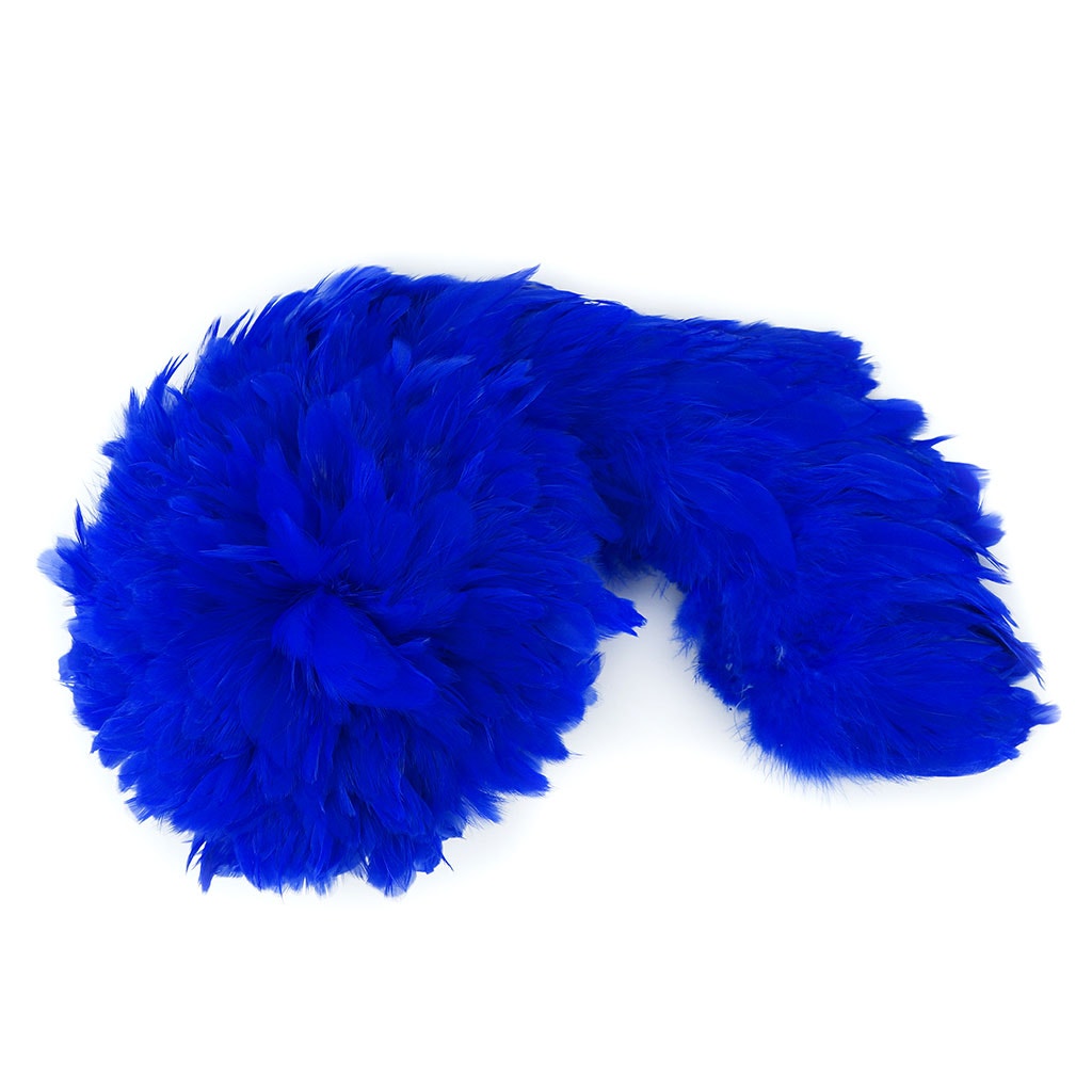 Strung Rooster White-Dyed Schlappen Feathers approximately 3-5 inches long are strung (sewn) together near the top of each quill. rooster schlappen (body) feathers are thicker than saddles or hackle feathers (ranging 1/2-3/4 inch wide), and are more rounded at the tip. Schalappen feathers soft flexible feathers, and fluffy near the quill. This variety of schlappen identified as White-Dyed Schlappen is naturally white. When dyed, these feathers are bright, vivid colors.