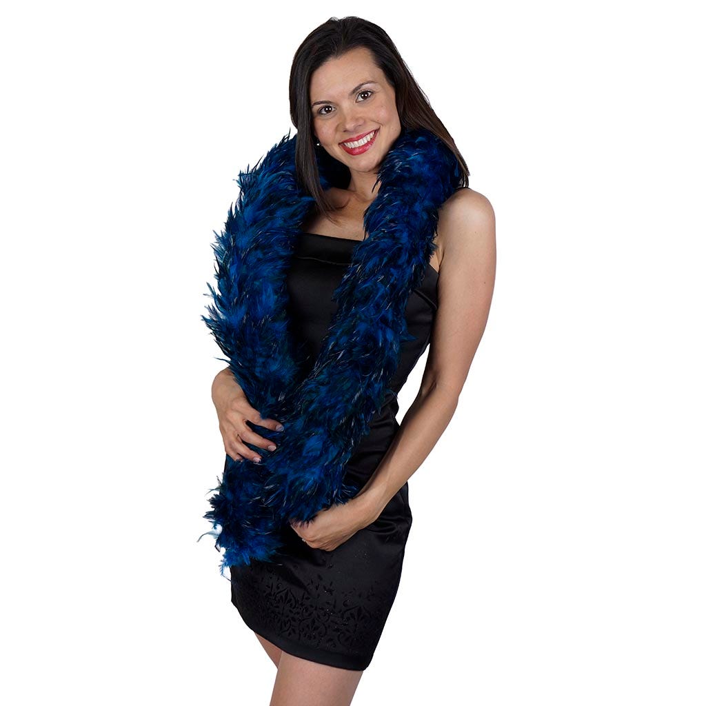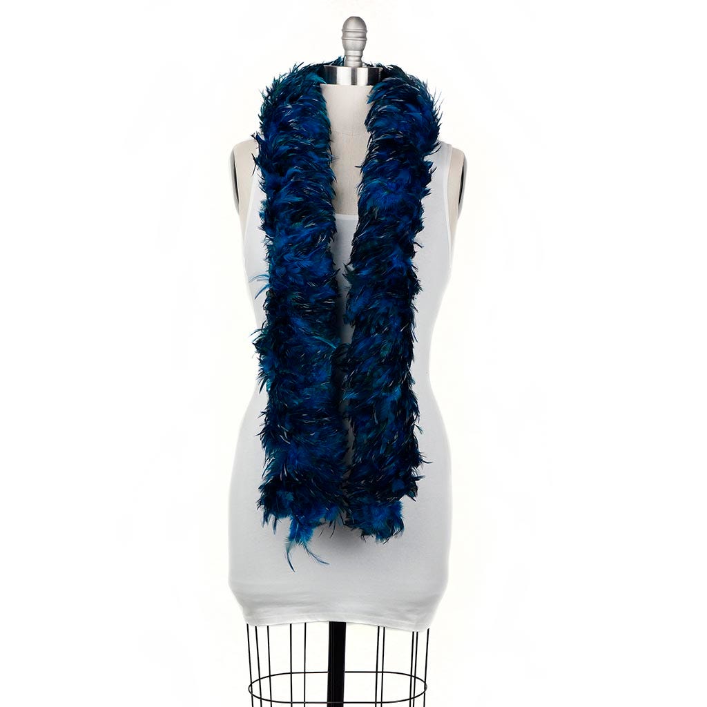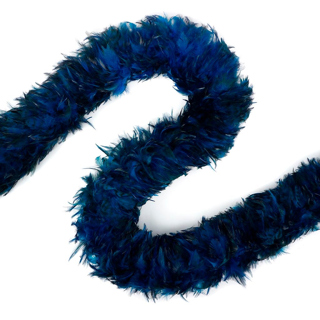 This luxury feather boa is made from dyed red chinchilla saddle feathers and measures 5-6" in diameter. Saddle feathers are pointed and flexible with lots of movement. This turquoise feather boa is dyed over the natural red chinchilla color giving the boa a unique jewel tone appearance with some natural markings showing. Our Zucker feather boa can be cut with wire cutters without unraveling as feathers are sewn on to a nylon cord and cotton-covered wire. The cotton-covered wire helps the boa keep its shape and not come untwisted.