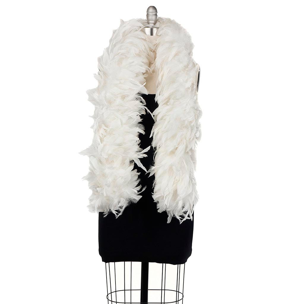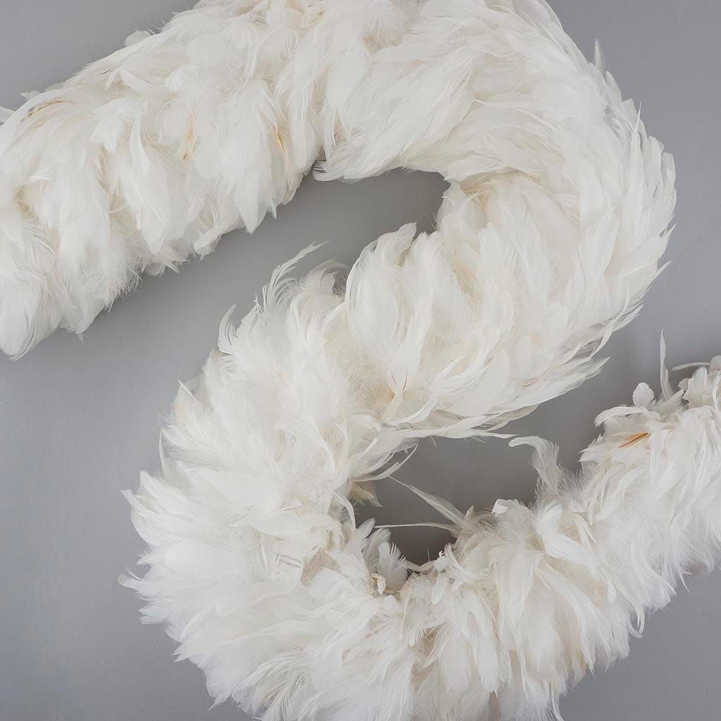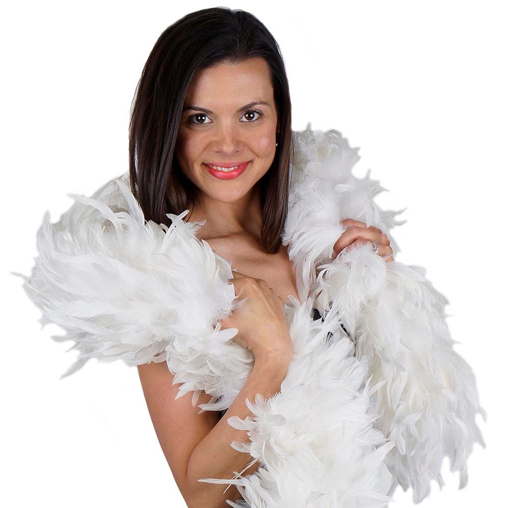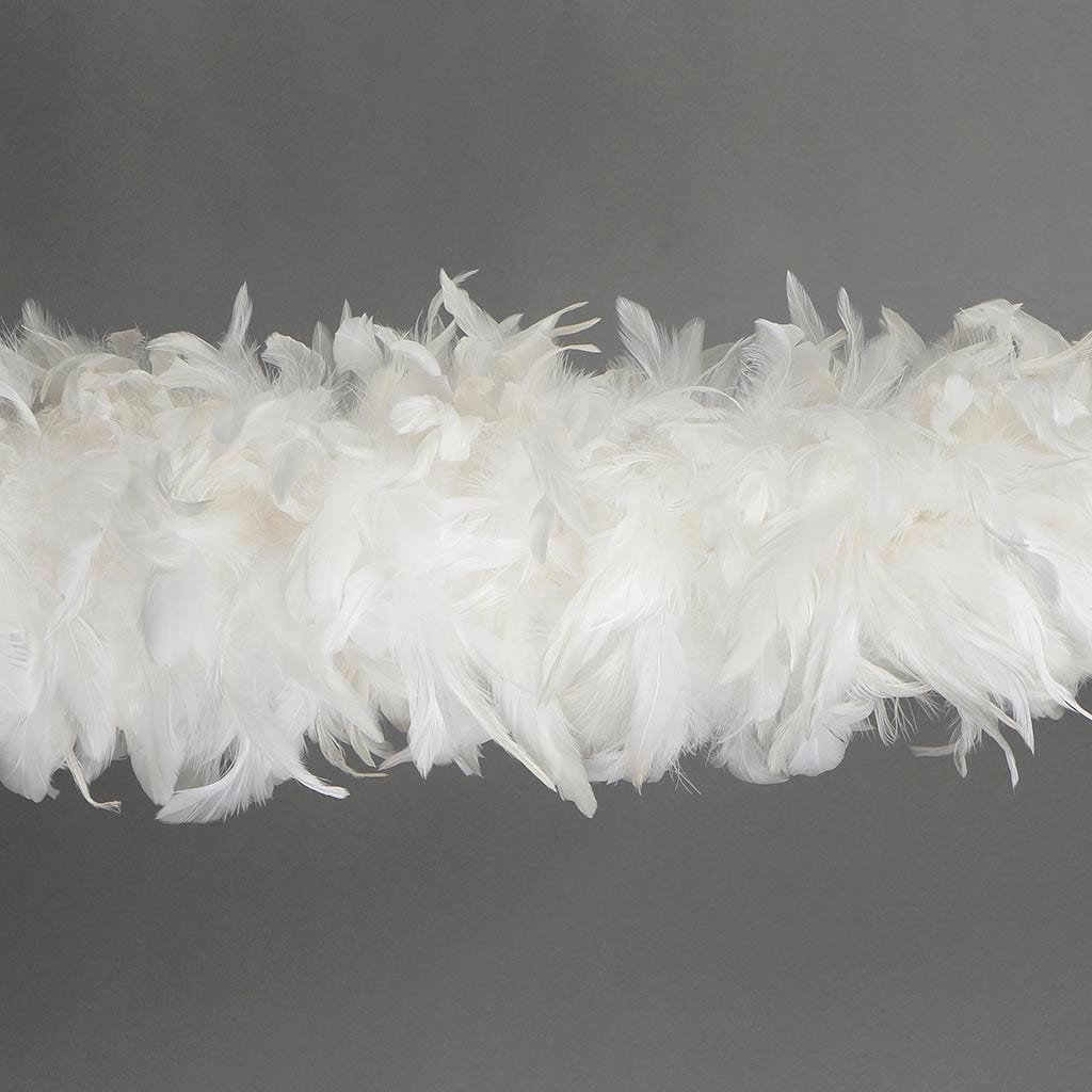 This white feather boa measures 2 yards (6 ft) long and approx. 8-10" diameter. Although we stock this luxurious feather boa only in white, the unique bright white coloration lends itself to dyeing vibrant colors. Our Zucker feather boa can be cut with wire cutters without unraveling as feathers are sewn on to a nylon cord and cotton-covered wire, which helps this luxurious feather boa keep its shape and not come untwisted.