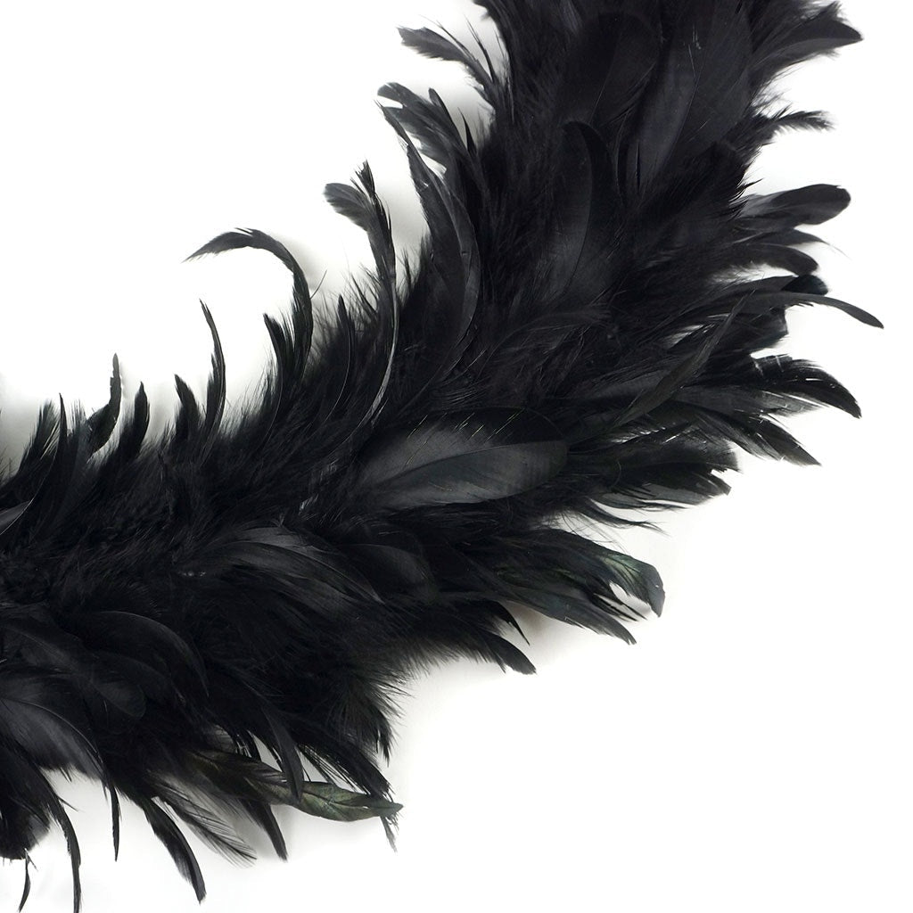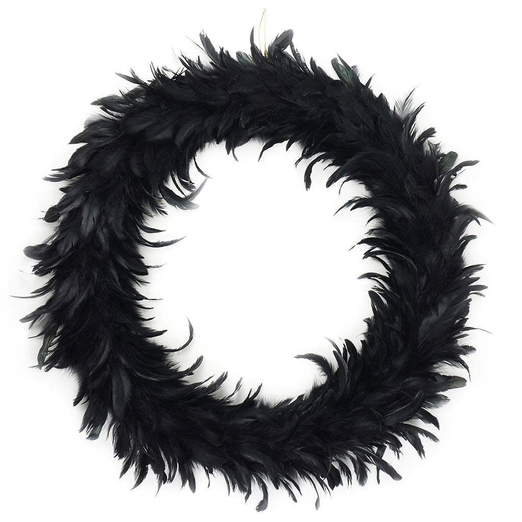 This handmade elegant Feather Holiday Wreath is made with Natural or dyed Black Rooster Schlappen feathers with an overall diameter measuring approximately 22-23 inches. The base of this feather wreath is a lightweight foam structure with a 20 inch diameter and 14.5 inch opening at the center making it easy to puncture with nail or hook for hanging purposes.