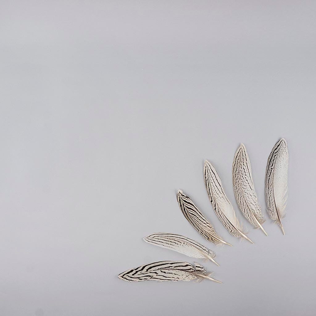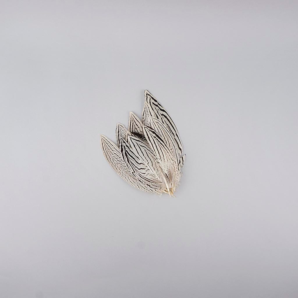 Natural Silver Pheasant Tail Feathers range in size from 4-6 inches long and come in a 12 piece package. Silver Pheasant Tail feathers are natural white and have varying natural black markings and stripes throughout the feather with a sturdy center quill.