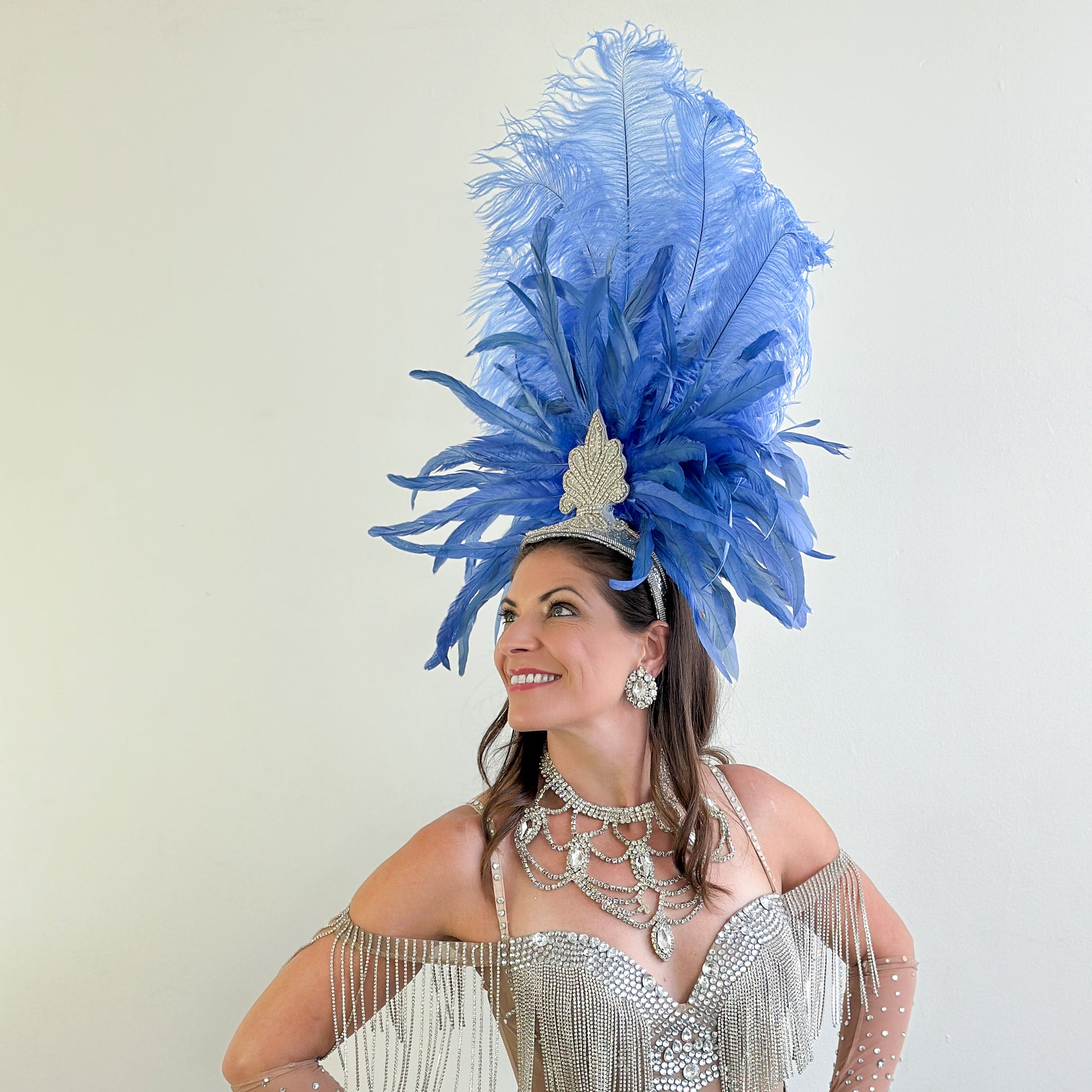 "Her name was Kitty"...Channel the glamour of the legendary showgirls with this dazzling feather headdress. Handmade with layers of lush ostrich and rooster feathers, it rises dramatically to capture the spirit of vintage cabaret and old Vegas stage shows. A sparkling rhinestone appliqué crowns the removable glitter base, catching the light with every move. Designed for comfort and security, this piece features both an elastic band and hair clip, ensuring it stays perfectly in place while you dance the night away. Available as a set— create your own show-stopping look today. Additional Costume accessories not included.