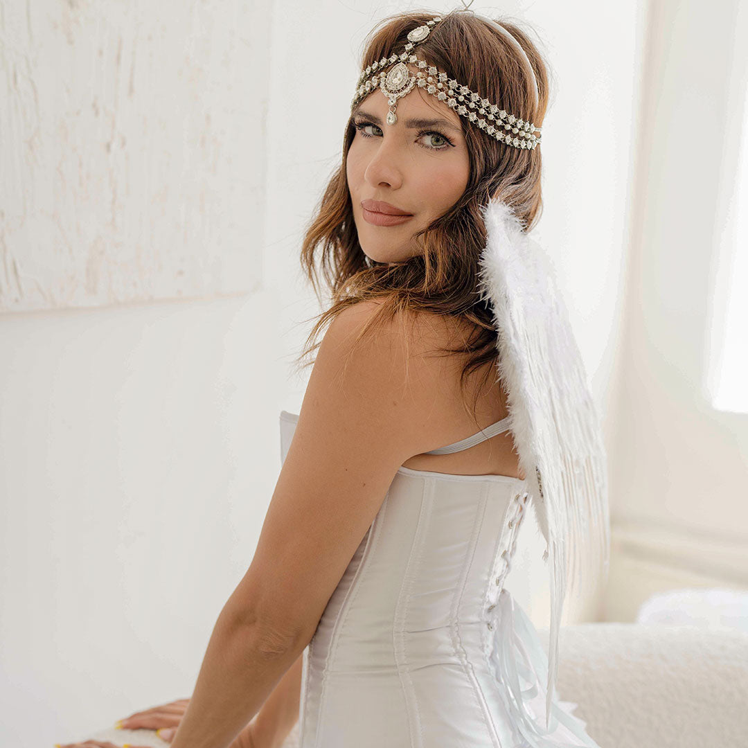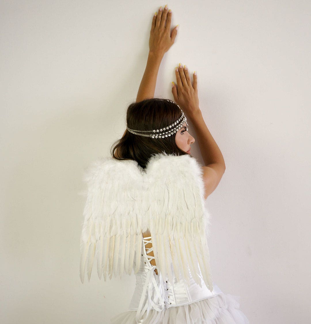 Angel costume with white angel wings perfect for Halloween costumes or cosplay. These small feathered wings add a celestial touch to any angelic or fairy ensemble.