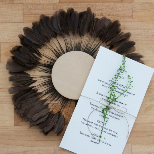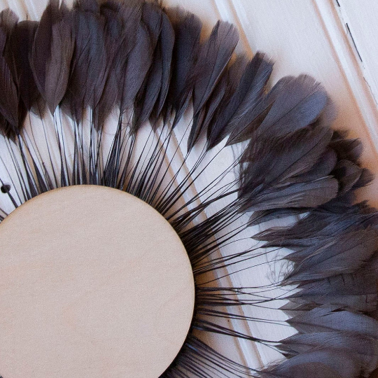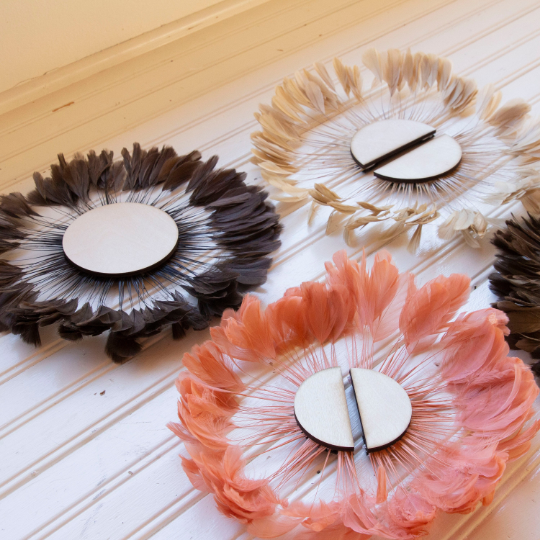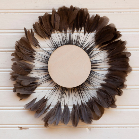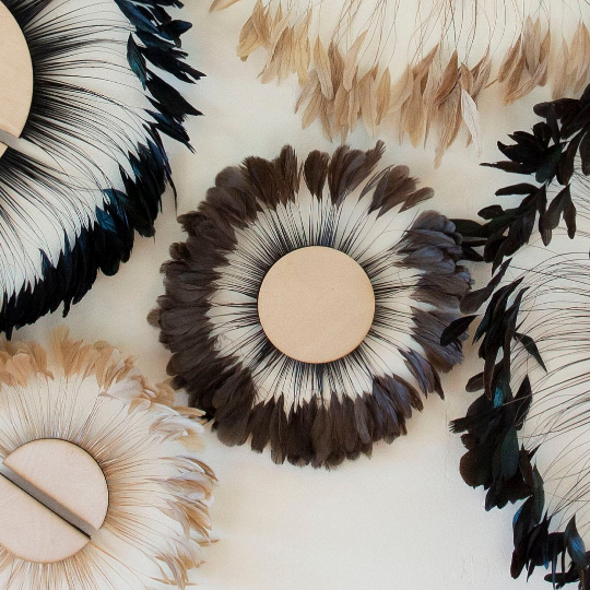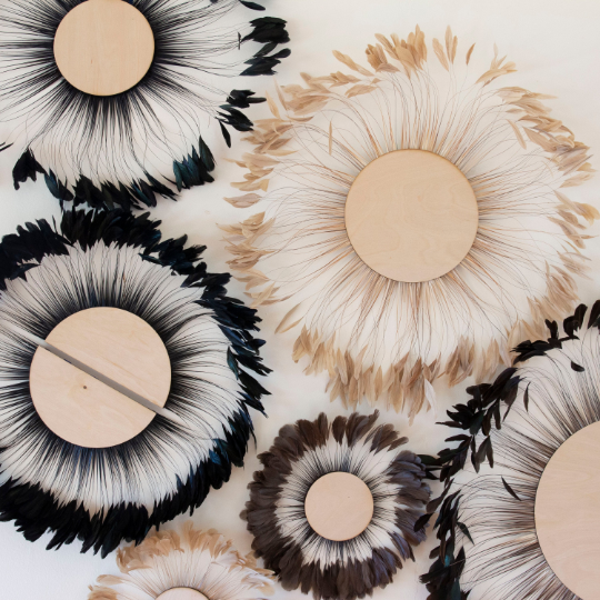 Decorate with eco friendly decor, perfect for the Modern or Bohemian home. Handmade with stripped coque tail feathers and wooden discs, these feather shapes compliment any wall space or table setting.