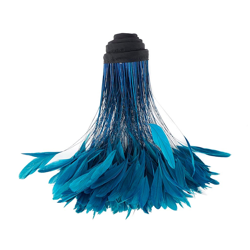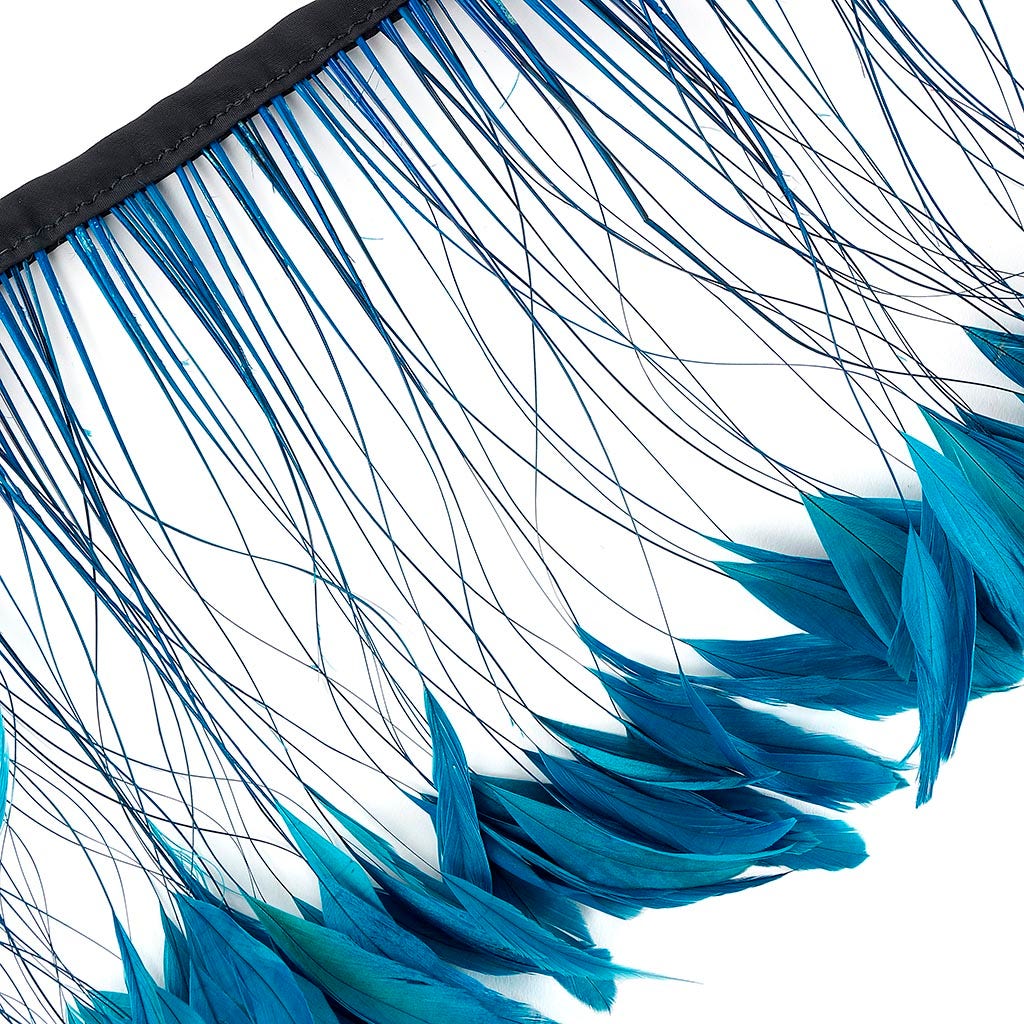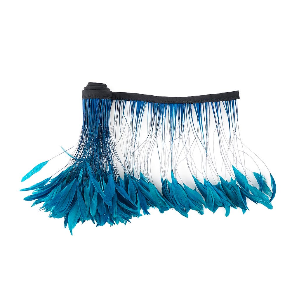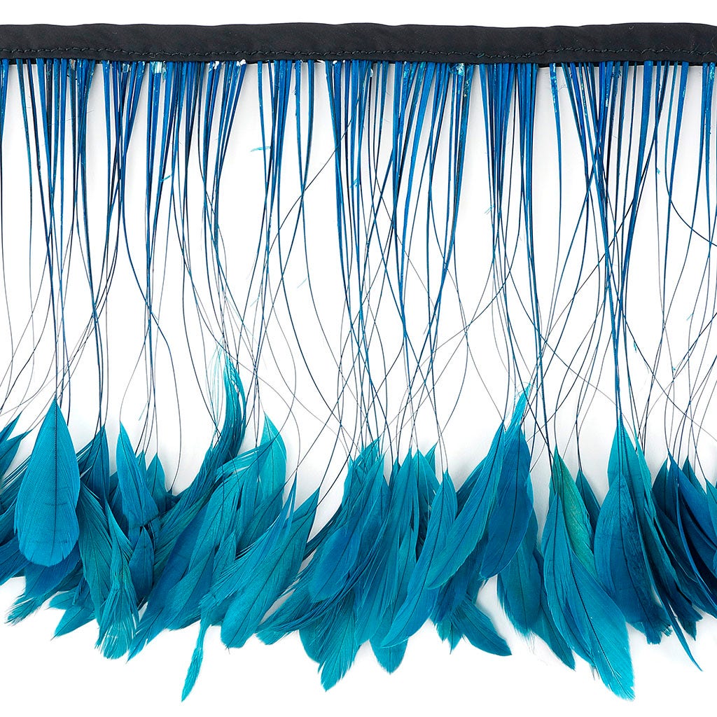 Stripped Bleached and Dyed Coque Tail Feather Fringe with Bias Tape 8-10" inches long by 1 yard roll (36") sewn on to a polyester-blend bias tape. There are approx 8-10 feathers per inch. Stripping is a process that removes approximately 3/4 inches of Coque feathers (located on the tail of the Rooster) from the bottom portion of the stem, to leave beautiful feather tips in order to create a very unique couture look.