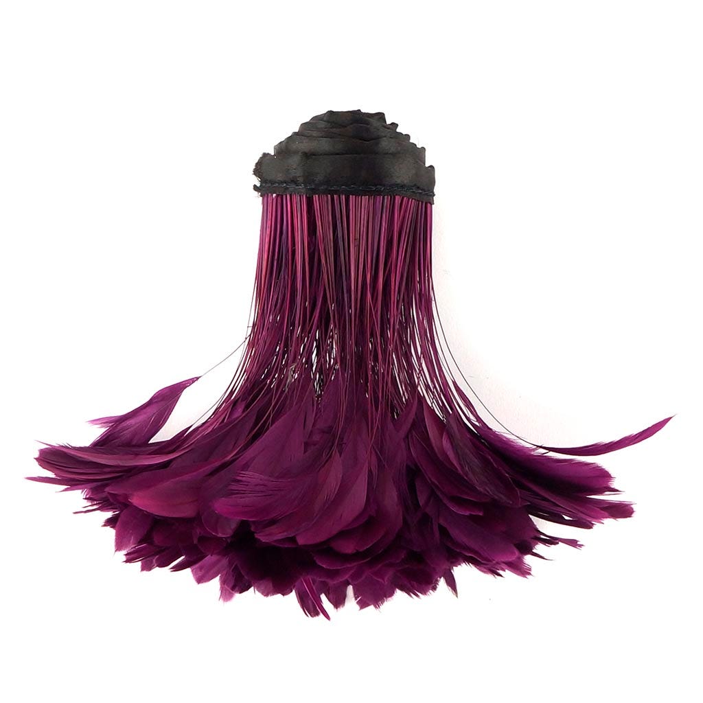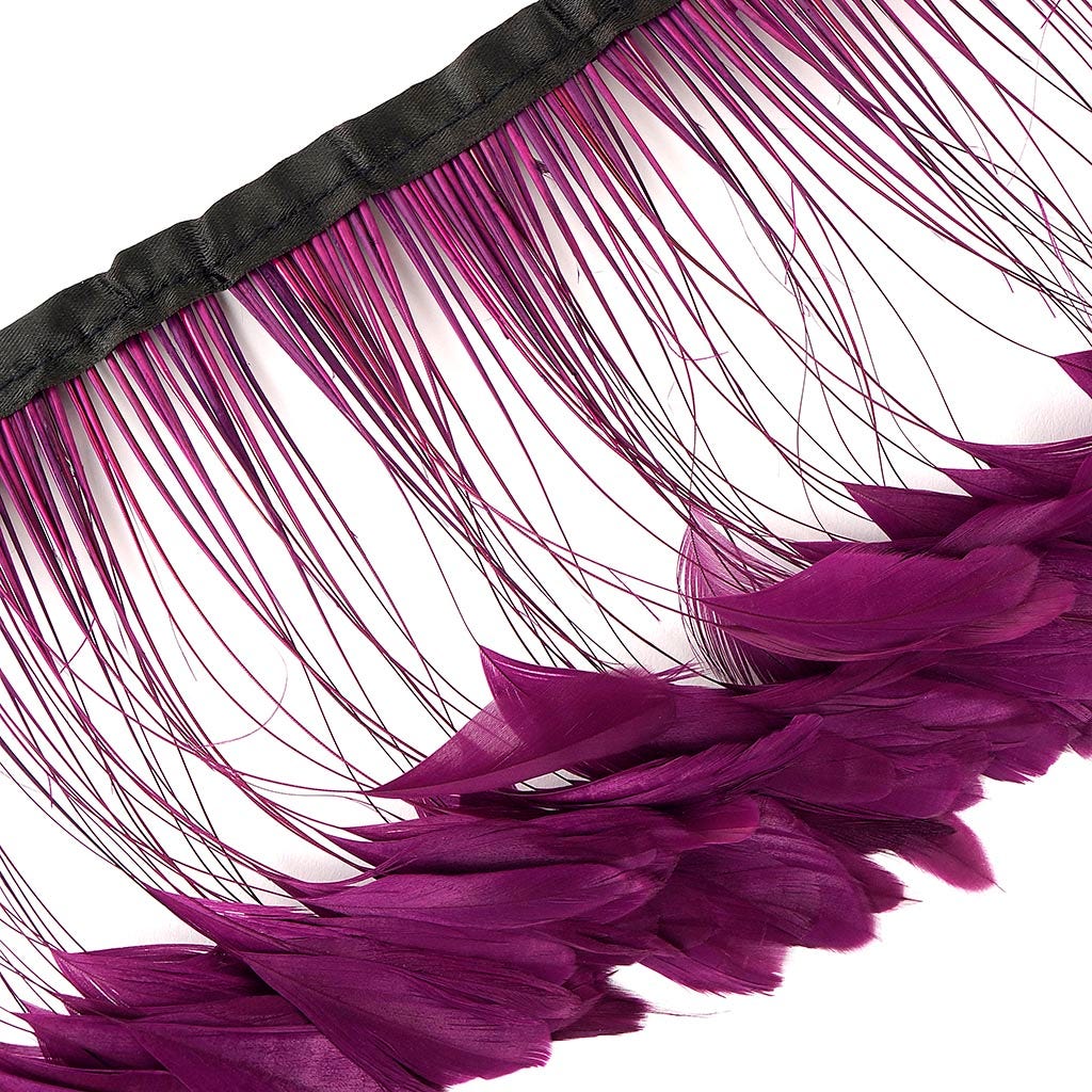 Stripped Bleached and Dyed Coque Tail Feather Fringe 4-6" inches long by 1 yard roll (36") sewn on to a polyester-blend bias tape. There are approx 18-20 feathers per inch. Stripping is a process that removes approximately 3/4 inches from Coque feathers (located on the tail of the Rooster) from the bottom portion of the stem, to leave beautiful feather tips in order to create a very unique couture look.