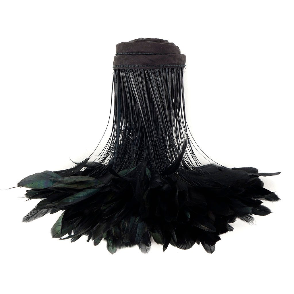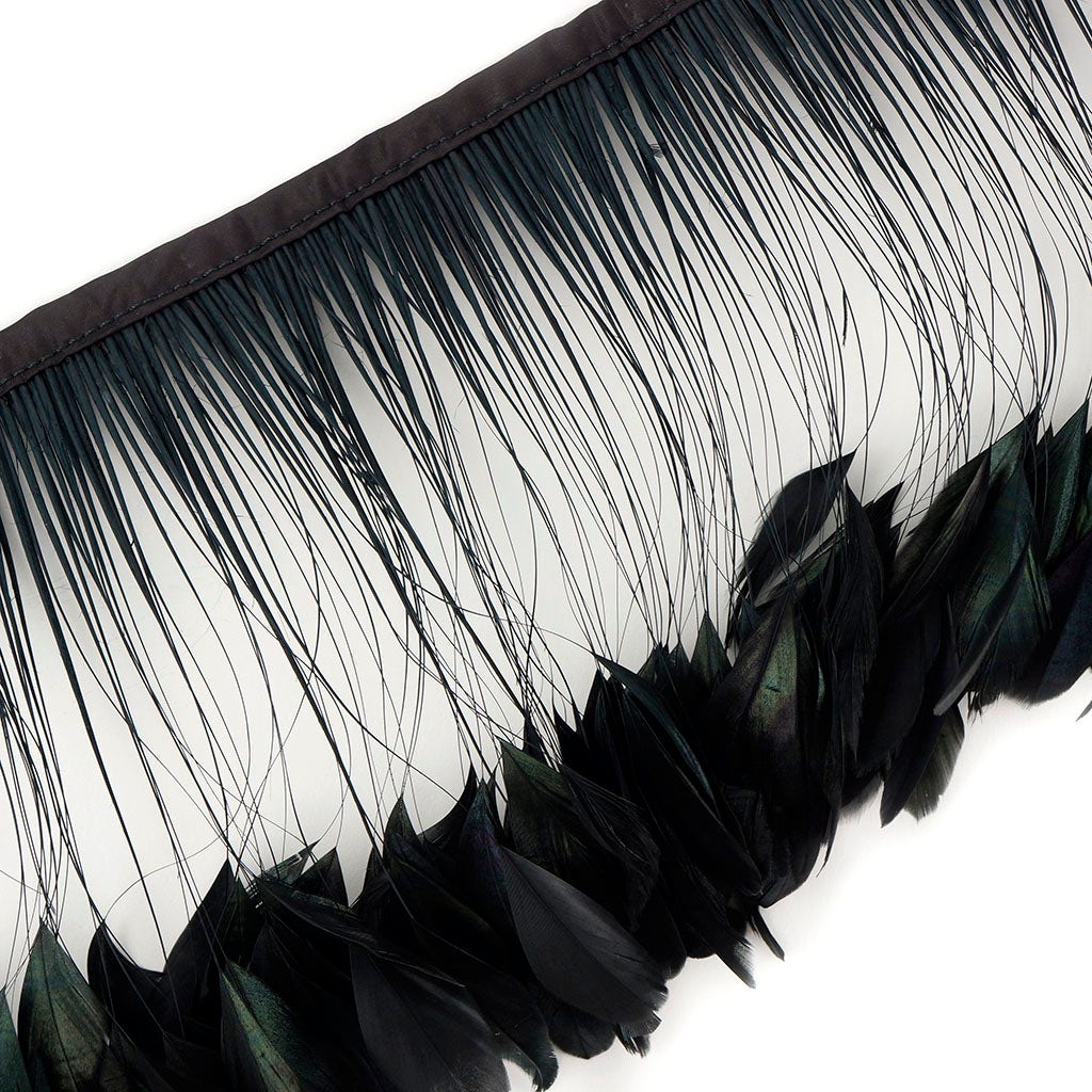 Stripped Iridescent Coque Tail Feather Fringe with Bias Tape 6-8" inches by 1 yard roll (36"). This handmade Feather Fringe is made from Coque feathers (located on the tail of the Rooster) that have been stripped and sewn on to a polyester-blend bias tape. There are approx 16-18 feathers per inch. Stripping is a process that removes approximately 3/4 inches of feather from the bottom portion of the stem, to leave beautiful feather tips in order to create a very unique couture look. When feathers on this natural bronze trim are dyed they continue to have an iridescent shine. The tips of the coque feathers are thicker and wider than the stripped hackles.