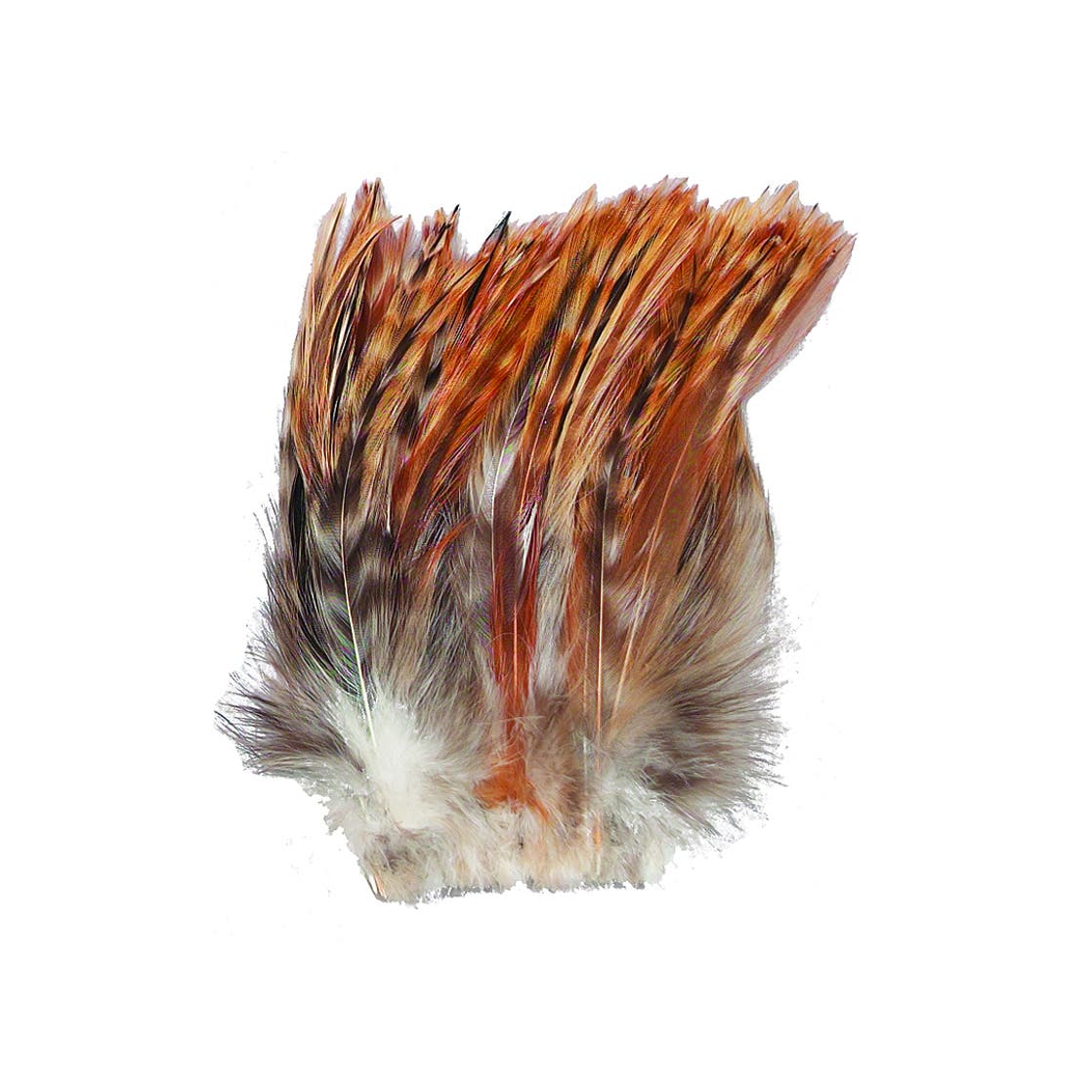 Strung Natural Red Chinchilla Rooster Hackle Feathers approximately 4-6 inches long and come in a 1.4 gram package. These feathers are strung (sewn) together near the tip of the quill in a 1 inch piece package.