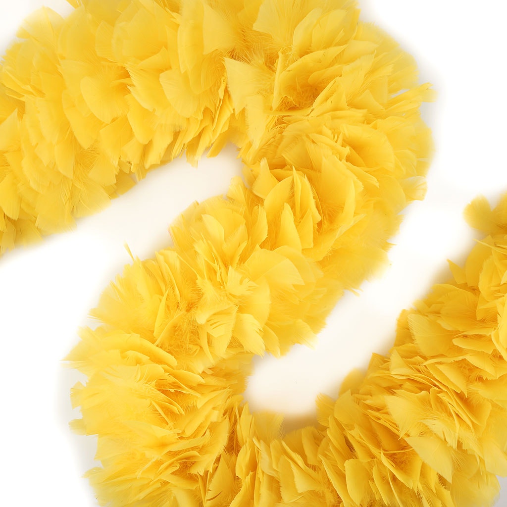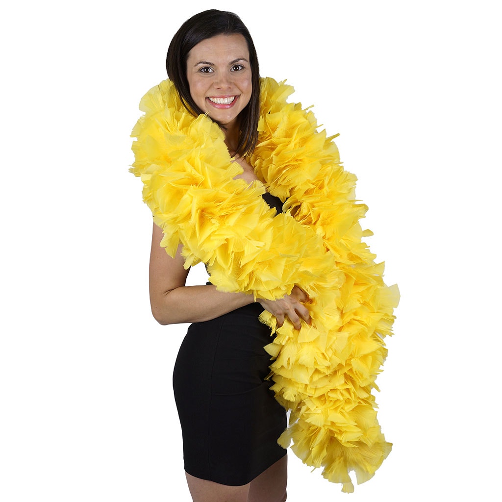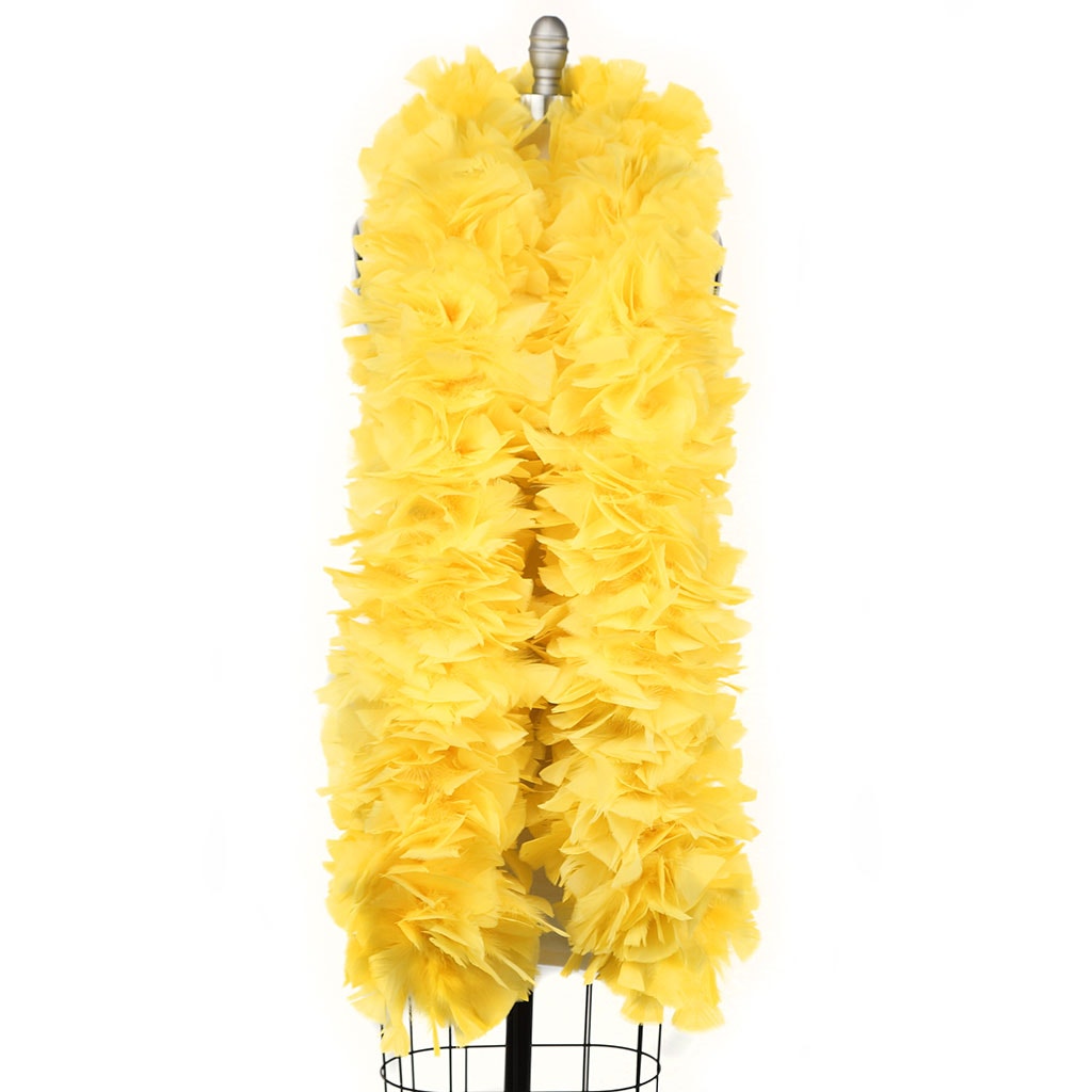 Our luxurious feather boa is made from quality turkey feathers with wide tips. This yellow feather boa measures 2 yards (6 ft) long and approx 6-8" in diameter. This paticular boas is our smallest and least expensive turkey boa. This Zucker feather boa can be cut with wire cutters without unraveling as feathers are sewn onto a nylon cord and cotton-covered wire, which helps it keep its shape and not come untwisted.