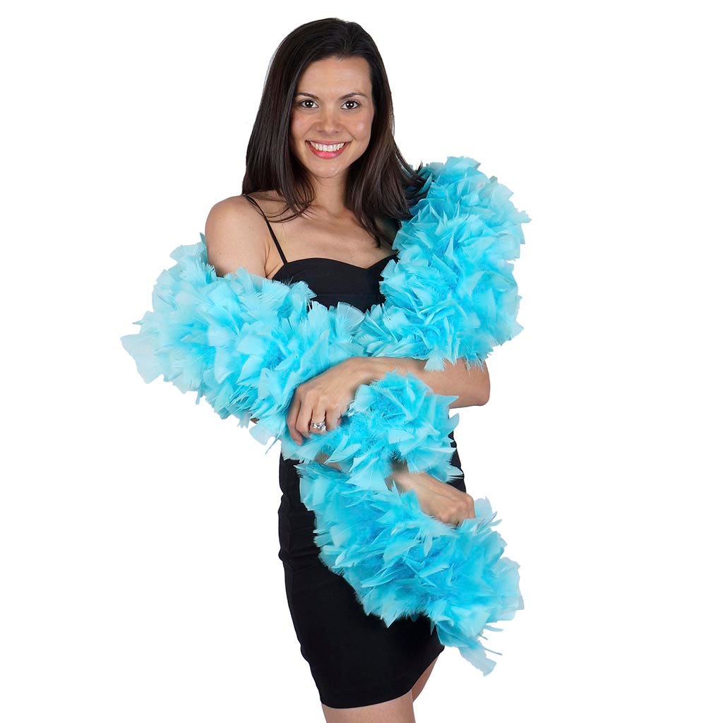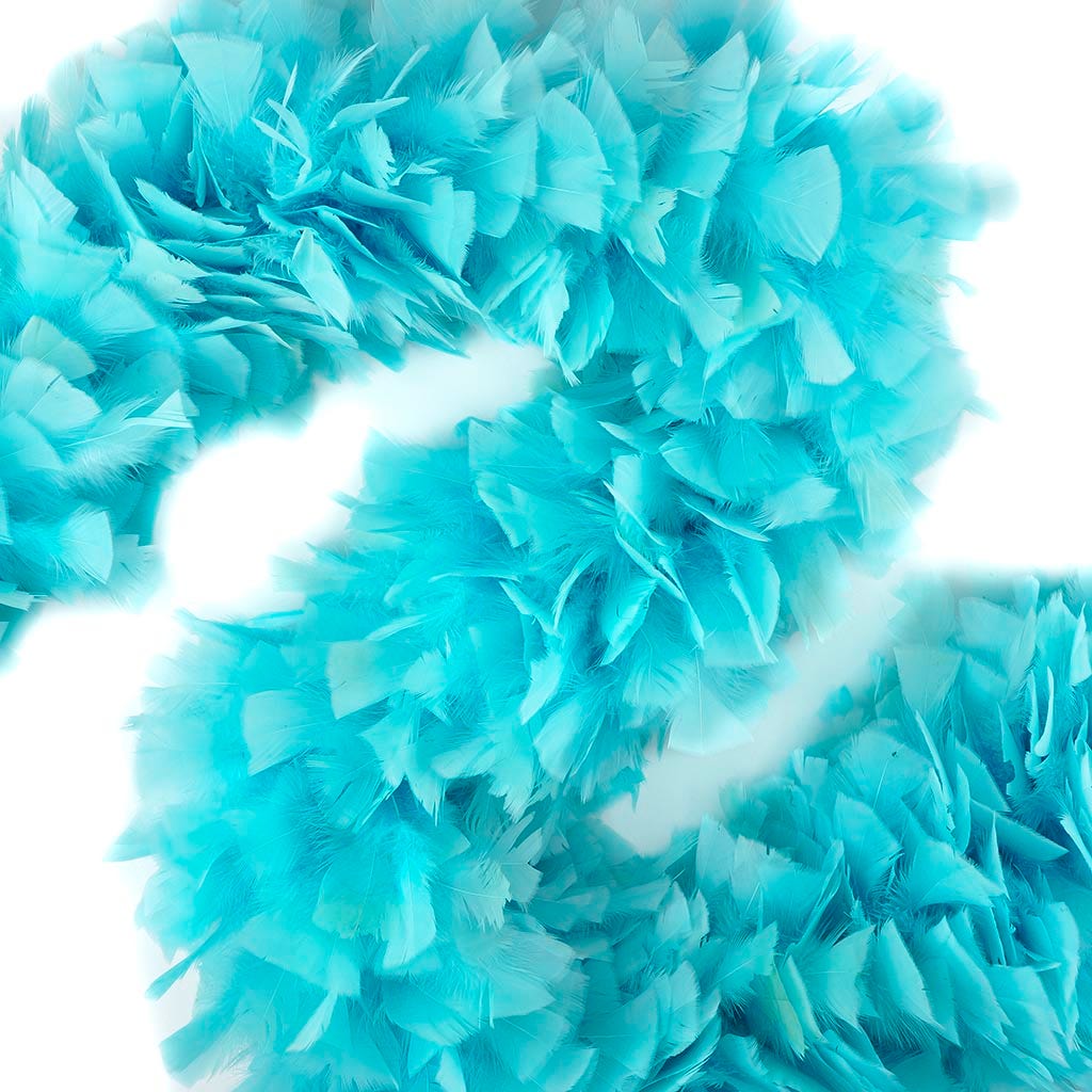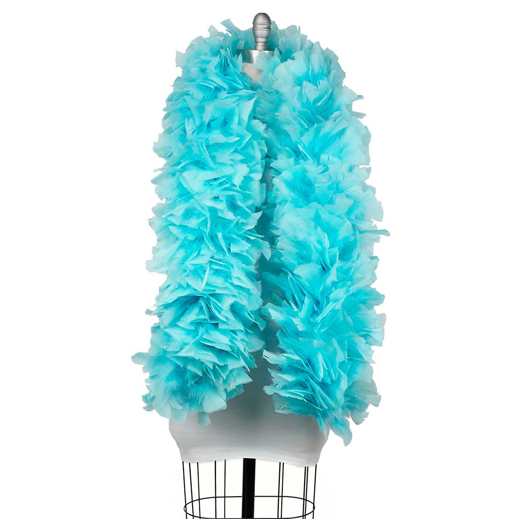 Our luxurious feather boa is made from quality turkey feathers with wide tips. This turquoise feather boa measures 2 yards (6 ft) long and approx 8-10" in diameter. This Zucker feather boa can be cut with wire cutters without unraveling as feathers are sewn onto a nylon cord and cotton-covered wire, which helps it keep its shape and not come untwisted.