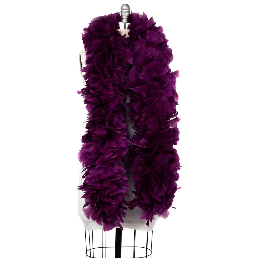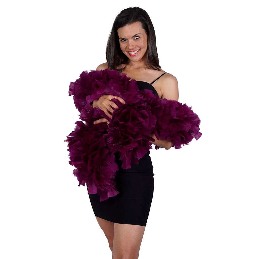 Our luxurious feather boa is made from quality turkey feathers with wide tips. This purple feather boa measures 2 yards (6 ft) long and approx 6-8" in diameter. This paticular boas is our smallest and least expensive turkey boa. This Zucker feather boa can be cut with wire cutters without unraveling as feathers are sewn onto a nylon cord and cotton-covered wire, which helps it keep its shape and not come untwisted.