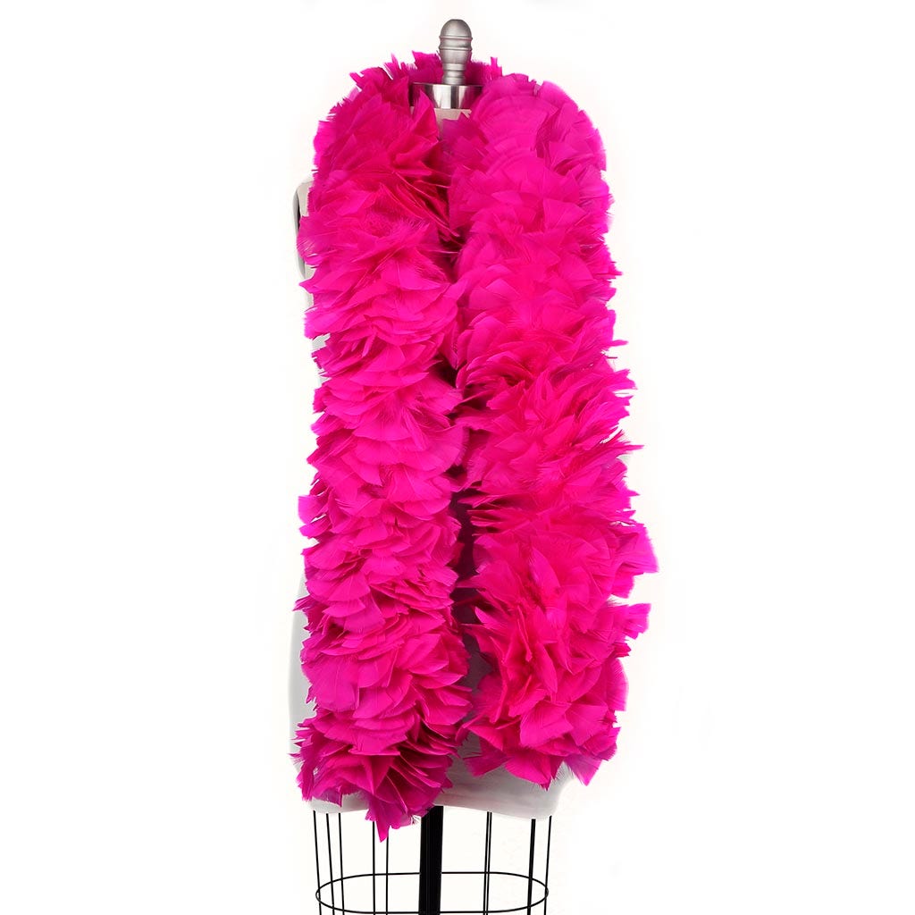 Our luxurious feather boa is made from quality turkey feathers with wide tips. This hot pink feather boa measures 2 yards (6 ft) long and approx 6-8" in diameter. This paticular boas is our smallest and least expensive turkey boa. This Zucker feather boa can be cut with wire cutters without unraveling as feathers are sewn onto a nylon cord and cotton-covered wire, which helps it keep its shape and not come untwisted.
