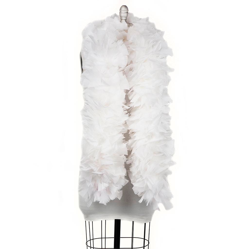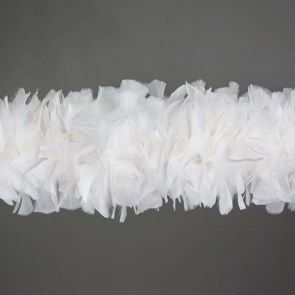 Our luxurious feather boa is made from quality turkey feathers with wide tips. This white feather boa measures 2 yards (6 ft) long and approx 6-8" in diameter. This paticular boas is our smallest and least expensive turkey boa. This Zucker feather boa can be cut with wire cutters without unraveling as feathers are sewn onto a nylon cord and cotton-covered wire, which helps it keep its shape and not come untwisted.