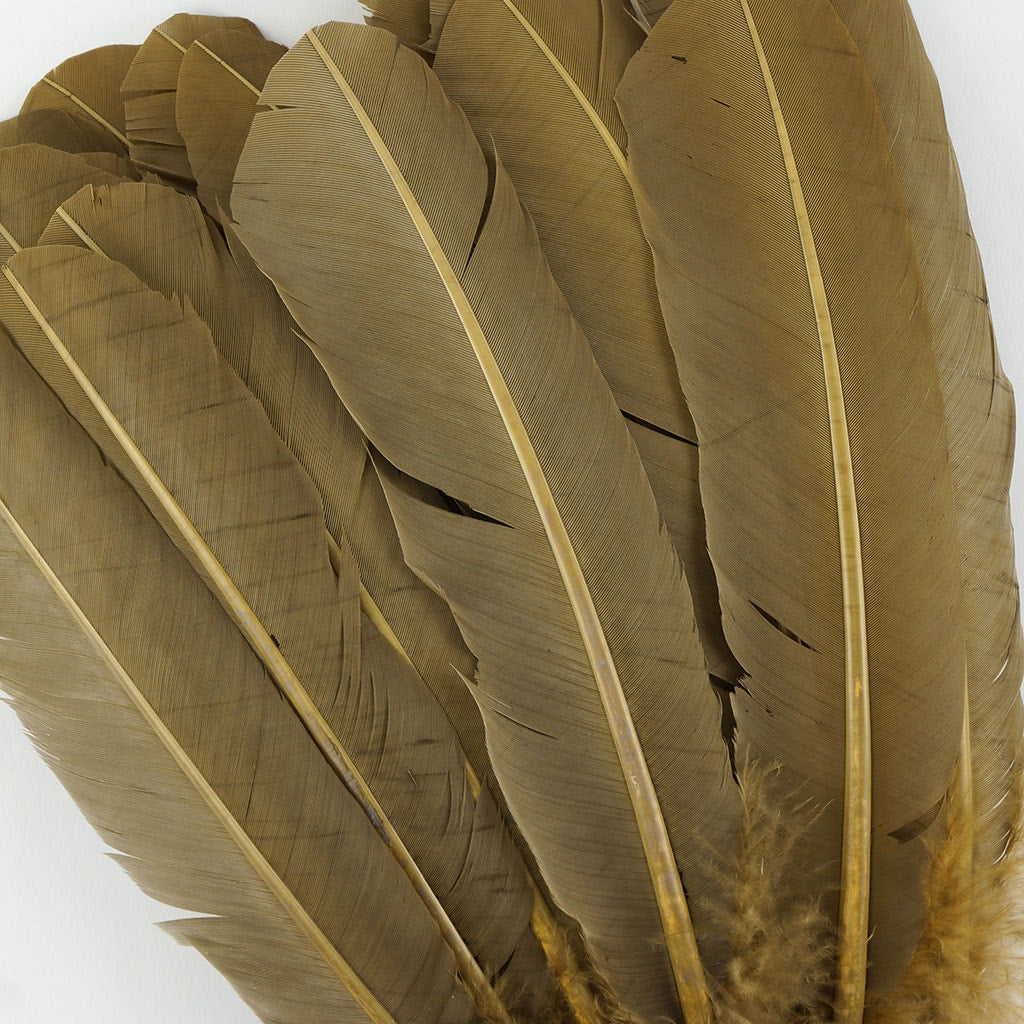 Selected Dyed Turkey Quill Left Wing Feathers are approximately 10-12 inches long and . The tops are cut for a more rounded uniform appearance. This items is a Left Side wing quill, but is available in either a Left or Right Side in a variety of colors. Sold by the 100 piece package.
