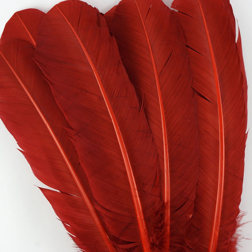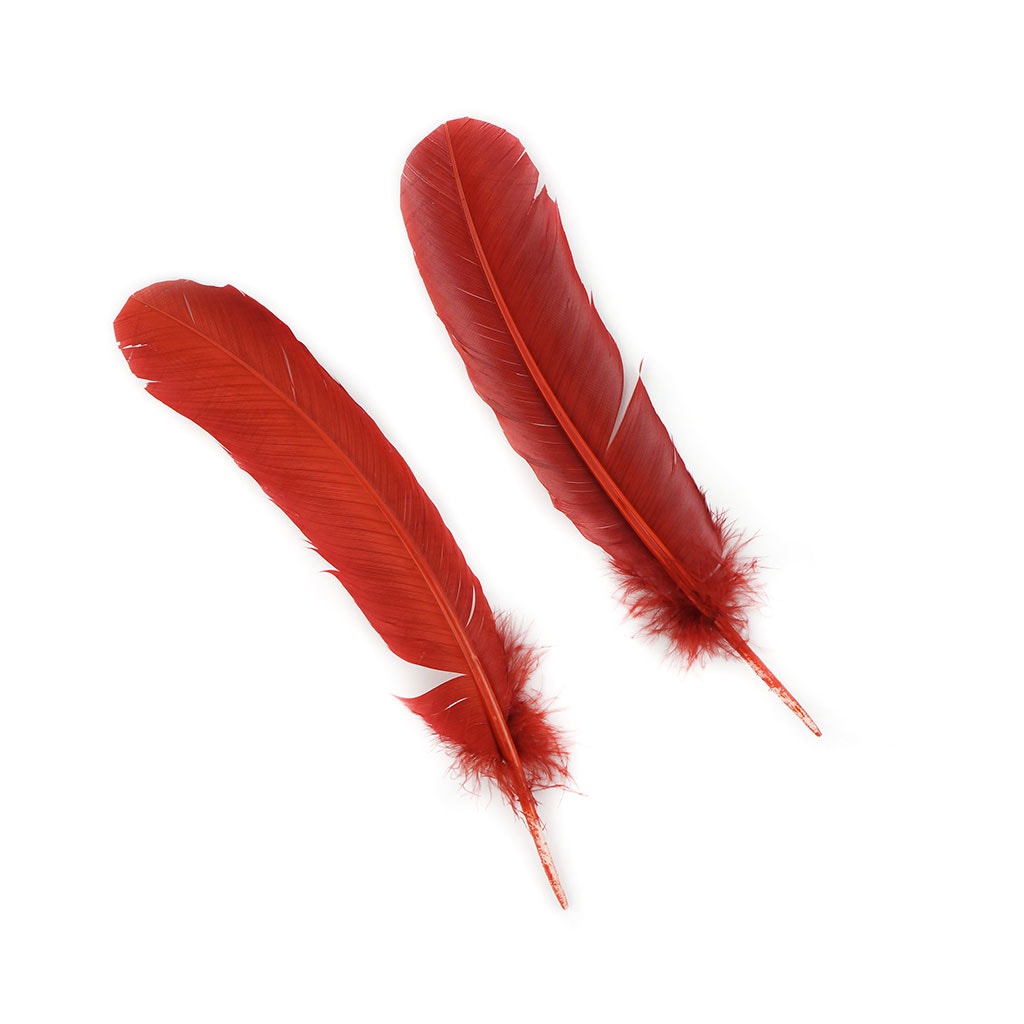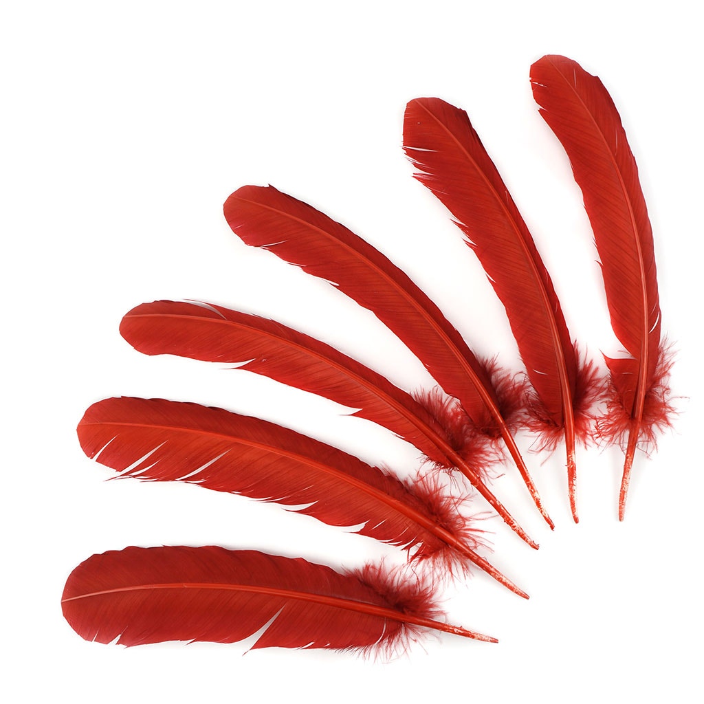 Selected Dyed Turkey Quill Left Wing Feathers are approximately 10-12 inches long and . The tops are cut for a more rounded uniform appearance. This items is a Left Side wing quill, but is available in either a Left or Right Side in a variety of colors. Sold by the 100 piece package.