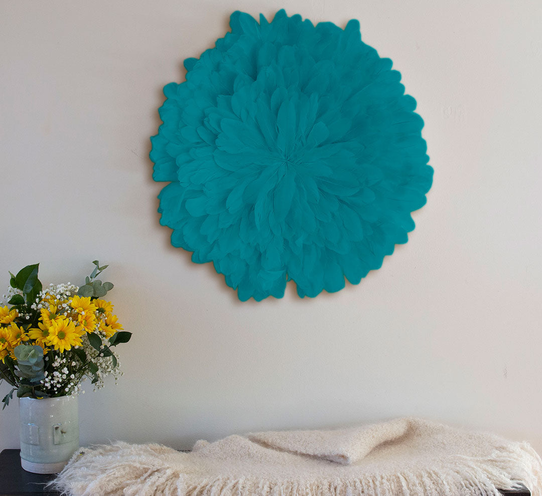 Unique Decorative Feather Wall Art Inspired by African JuJu Hats - Peacock Blue